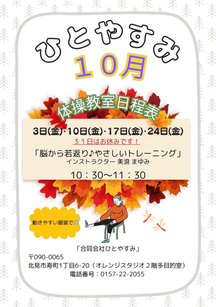 10月の体操教室は10月31日がお休みとなっていますので、よろしくお願いいたします。